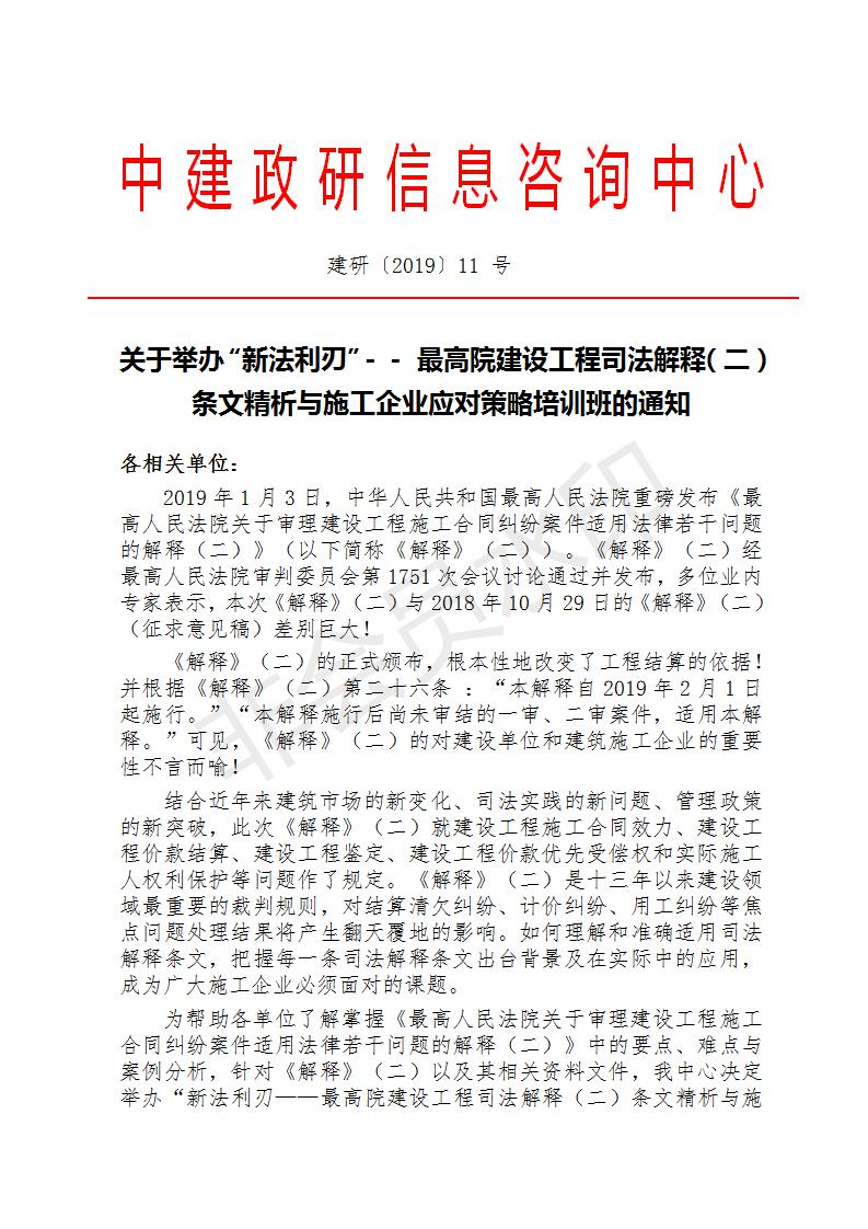 關(guān)于舉辦“新法利刃”—最高院建設(shè)工程司法解釋?zhuān)ǘ?nbsp; 條文精析與施工企業(yè)應(yīng)對(duì)策略培訓(xùn)班的通知
