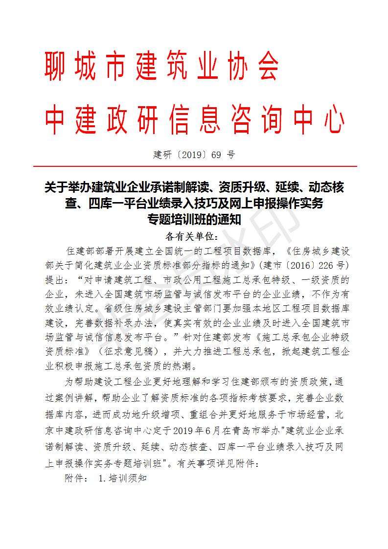 關于舉辦建筑業(yè)企業(yè)承諾制解讀、資質(zhì)升級、延續(xù)、動態(tài)核查、 四庫一平臺業(yè)績錄入技巧及網(wǎng)上申報操作實務 專題培訓班的通知